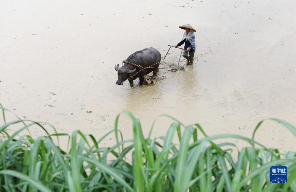 6月5日,農(nóng)民在貴州省黔東南苗族侗族自治州施秉縣雙井鎮(zhèn)翁西村耙田,準(zhǔn)備插秧。