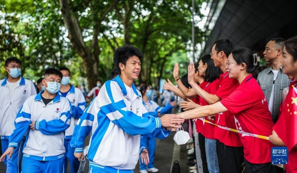 6月7日,在吉林省長春市五十六中學(xué)考點,考生入場前與送考老師擊掌。
