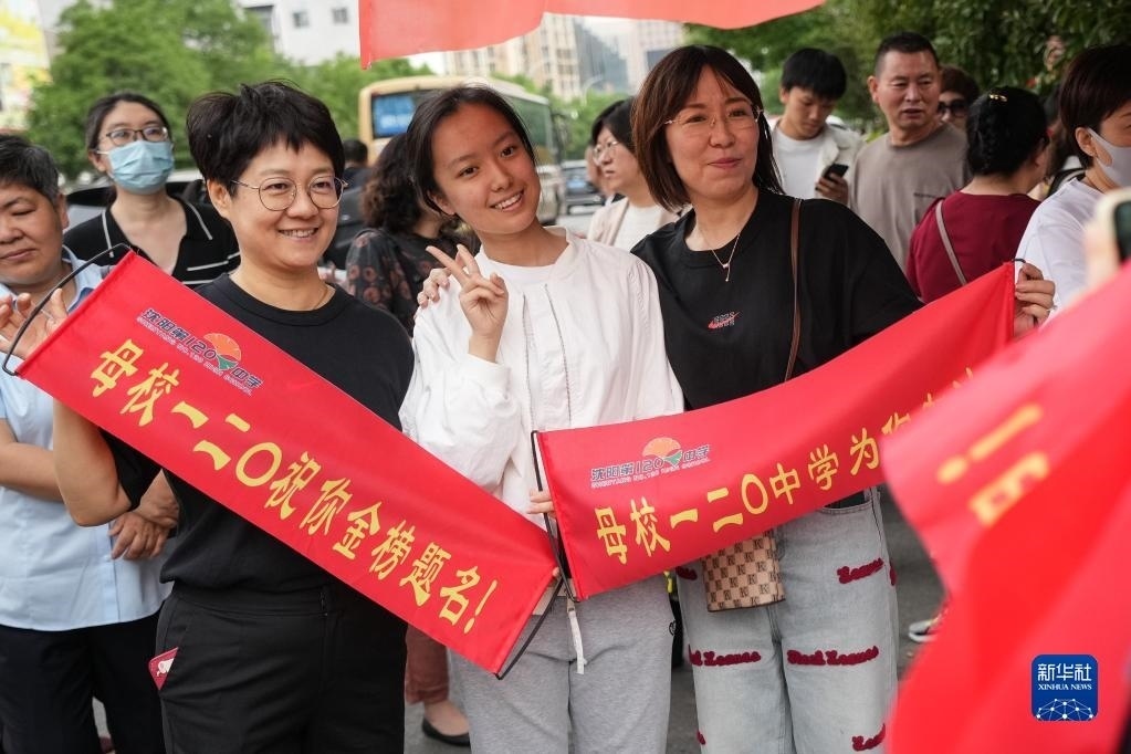 6月7日,考生在遼寧省實驗中學(xué)考點外與老師合影留念。
