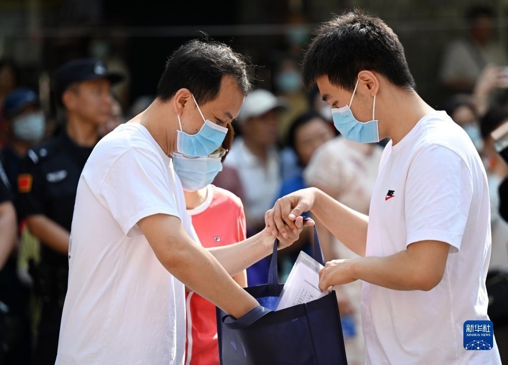 6月7日,在北京師范大學(xué)附屬實驗中學(xué)考點門口,考生家長給考生加油打氣。