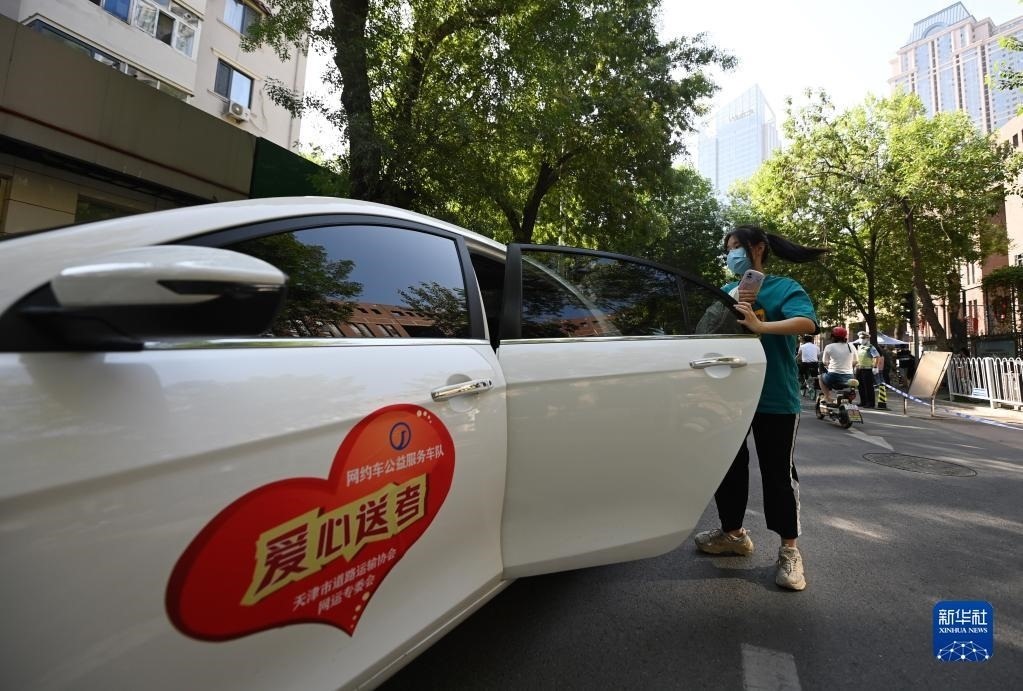 6月7日,在天津市耀華中學(xué)考點附近,考生從愛心送考車輛下車。