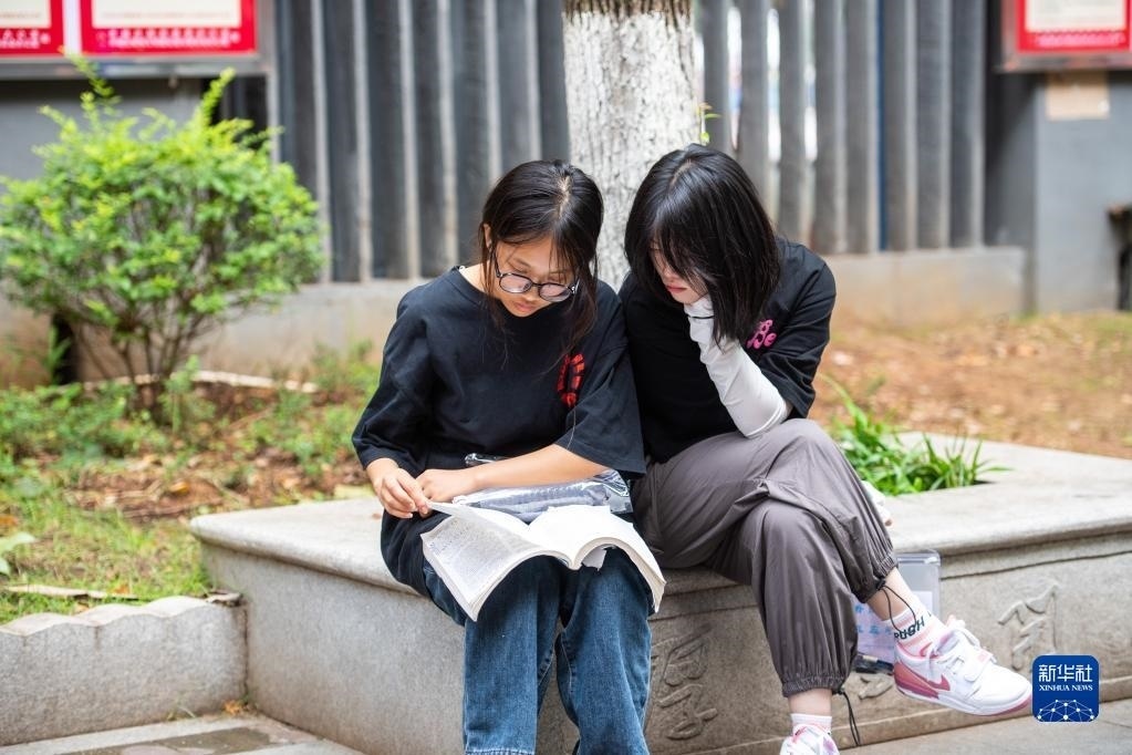6月7日,在湖南長沙市第一中學(xué)考點,考生在考場外復(fù)習(xí)。