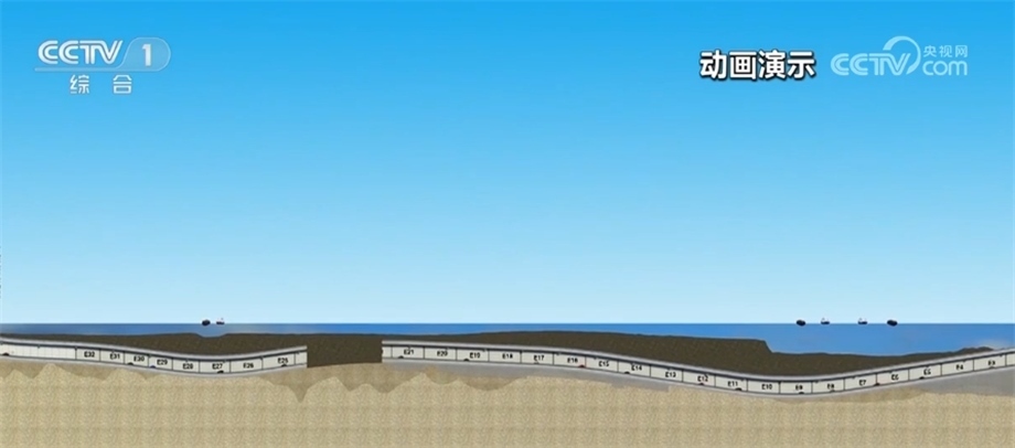 總臺(tái)央視記者 李偉代:我身后就是深中通道西人工島,它是深中通道橋隧轉(zhuǎn)換的關(guān)鍵構(gòu)造;從這里開始,深中通道將從橋梁部分轉(zhuǎn)入全長(zhǎng)6845米海底隧道部分,未來(lái)汽車將從這里駛?cè)牒5姿淼?,最深將在海?0米的沉管中行駛。