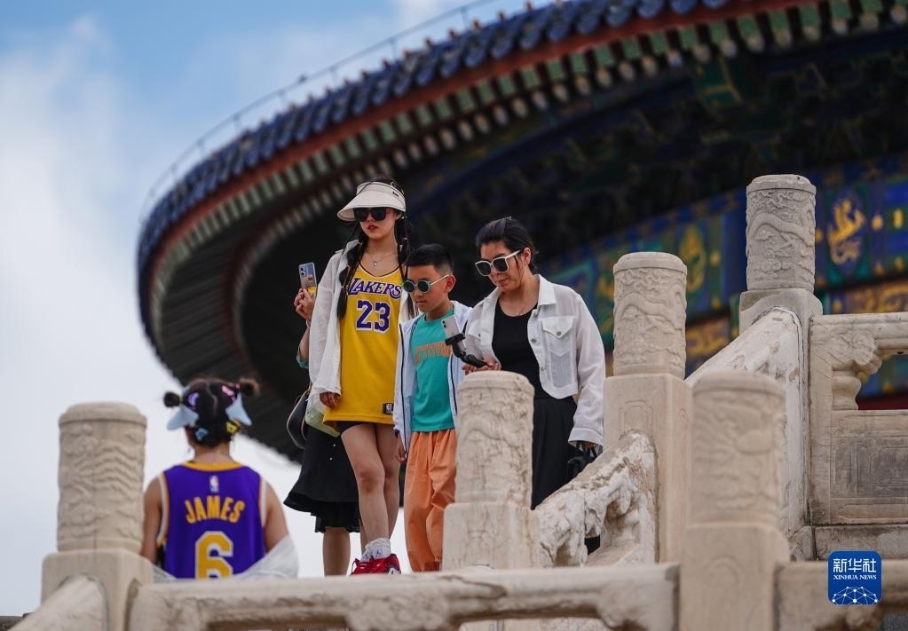 6月9日,游客在藍天白云下的天壇祈年殿游覽。