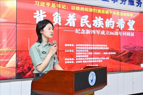 為深入學(xué)習(xí)貫徹習(xí)近平新時代中國特色社會主義思想主題教育,落實習(xí)近平加強全民國防教育的重要指示精神,弘揚愛國主義精神、增強全民國防意識,推動全民國防教育進校園,深化學(xué)?!按笏颊n”建設(shè),6月9日,由北京新四軍暨華中抗日根據(jù)地研究會、中華志愿者協(xié)會國防教育志愿服務(wù)總隊指導(dǎo),北京聯(lián)合大學(xué)黨委學(xué)生工作部(學(xué)生處)、黨委人民武裝部、黨委宣傳部、北京聯(lián)合大學(xué)新時代文明實踐中心建設(shè)規(guī)劃研究所、管理學(xué)院黨委共同主辦,管理學(xué)院學(xué)生工作辦公室承辦的“背負民族希望——紀(jì)念新四軍成立86周年回顧展”大會在北四環(huán)校區(qū)學(xué)生事務(wù)大廳舉行。