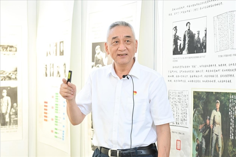 會后,領(lǐng)導(dǎo)嘉賓觀看“背負民族希望—紀(jì)念新四軍成立86周年回顧展”,張曉龍現(xiàn)場給大家講述新四軍的歷史沿革和征戰(zhàn)歷程。