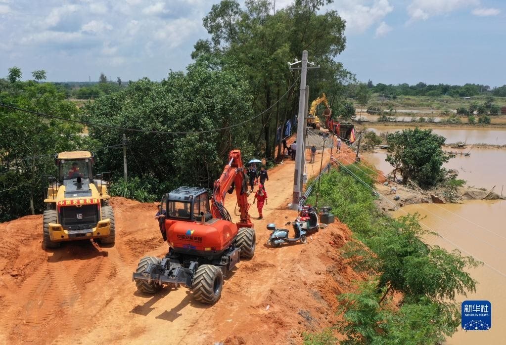 6月11日,在廣西合浦縣白沙鎮(zhèn),工人在施工修復(fù)遭洪水損毀的堤壩。