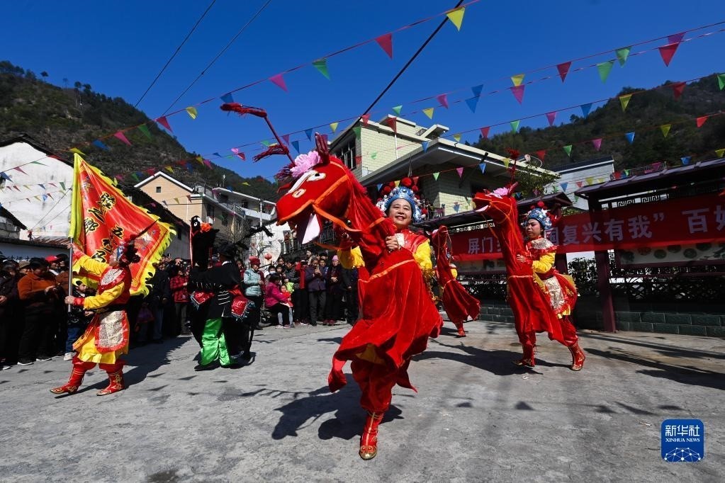 浙江杭州淳安縣屏門鄉(xiāng)屏前村傳統(tǒng)廟會(huì)上的竹馬表演(3月10日攝)。近年來(lái),屏門鄉(xiāng)當(dāng)?shù)貙⒚袼妆硌荨⑻で噘p春、農(nóng)家特產(chǎn)展賣等融入傳統(tǒng)廟會(huì)中,成為美麗山鄉(xiāng)的春季熱鬧“大戲”,助力鄉(xiāng)村文旅融合發(fā)展和共同富裕。新華社記者 徐昱 攝