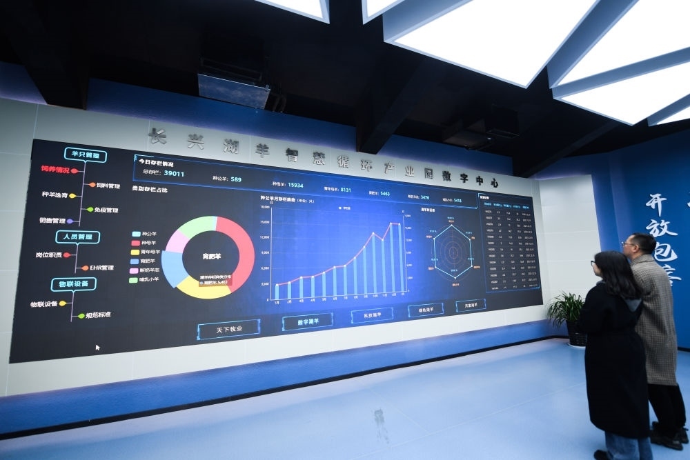 浙江省湖州市長興縣呂山鄉(xiāng)湖羊智慧循環(huán)產(chǎn)業(yè)園里的數(shù)字大屏實(shí)時(shí)顯示湖羊的各類監(jiān)控?cái)?shù)據(jù)(2022年1月6日攝)。新華社記者 徐昱 攝