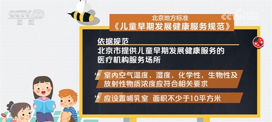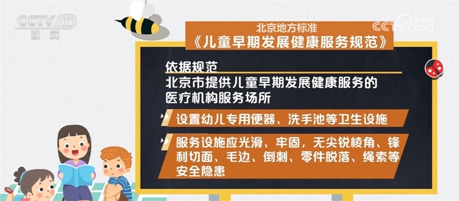 依據(jù)規(guī)范,北京市提供兒童早期發(fā)展健康服務(wù)的醫(yī)療機(jī)構(gòu)服務(wù)場所應(yīng)遠(yuǎn)離各種污染源,采光充足,通風(fēng)良好,遠(yuǎn)離噪聲與電磁干擾;設(shè)置防蚊、蟲、蠅、鼠等設(shè)備,并放置于兒童無法接觸到的地方;室內(nèi)空氣溫度、濕度、化學(xué)性、生物性及放射性物質(zhì)濃度應(yīng)符合相關(guān)要求。應(yīng)設(shè)置哺乳室,面積不少于10平方米;設(shè)置幼兒專用便器、洗手池等衛(wèi)生設(shè)施;服務(wù)設(shè)施應(yīng)光滑、牢固,無尖銳棱角、鋒利切面、毛邊、倒刺、零件脫落、繩索等安全隱患。