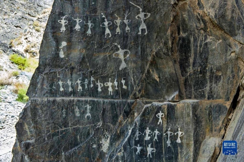 甘肅省嘉峪關(guān)市黑山巖畫(huà)中的一幅眾人舞蹈巖畫(huà)(資料照片)。