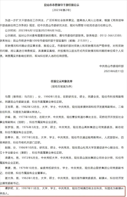 ·中共昆山市委組織部干部監(jiān)督科回應97年出生女子擬提名副鎮(zhèn)長:是按正常流程進行,有問題可以監(jiān)督舉報。