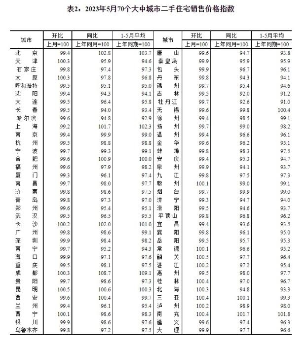 2023年5月70個(gè)大中城市二手住宅銷(xiāo)售價(jià)格指數(shù)。 截圖自國(guó)家統(tǒng)計(jì)局官網(wǎng)