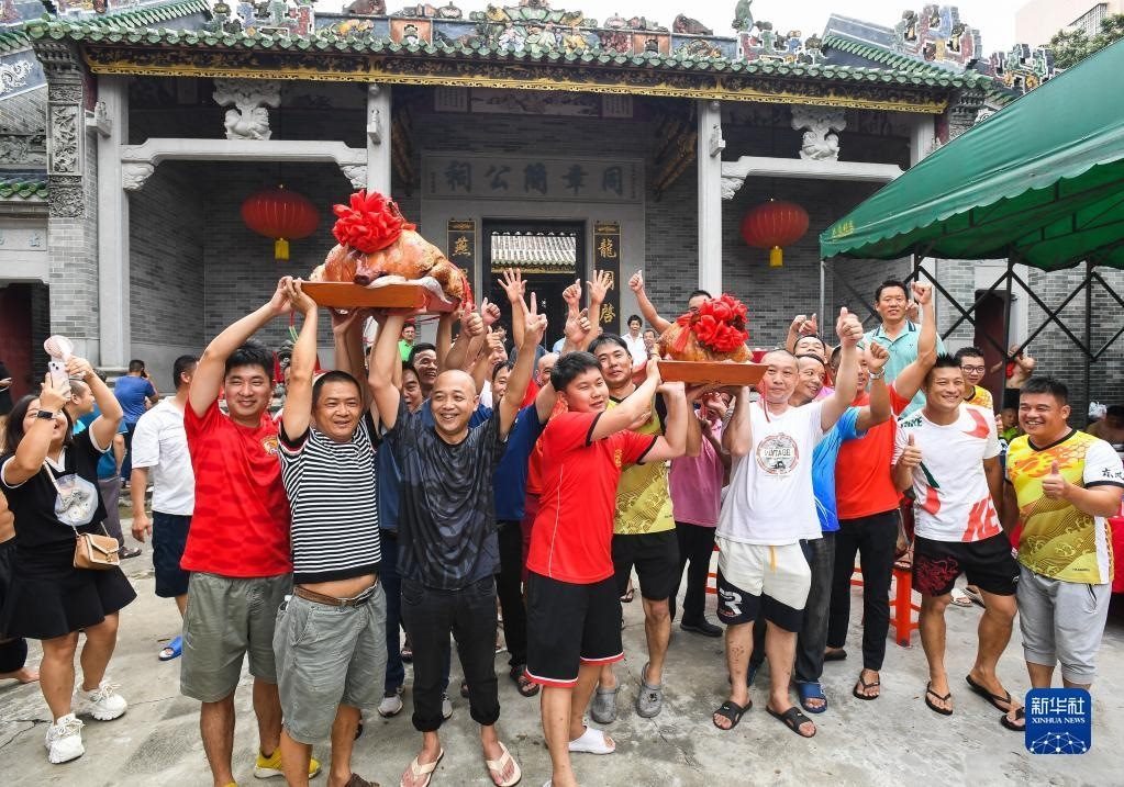6月15日,2023年車陂龍舟競渡第一名“范陽簡”龍船會(huì)的成員們在家祠前抬著獎(jiǎng)品燒豬慶祝。