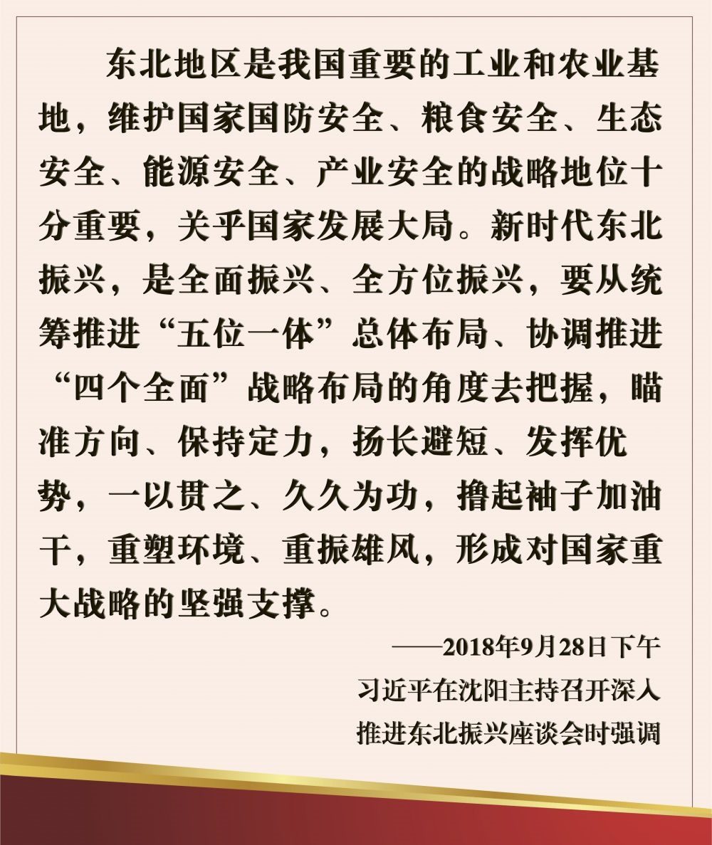他強調(diào),新時代新征程推動?xùn)|北全面振興,要貫徹落實黨的二十大關(guān)于推動?xùn)|北全面振興實現(xiàn)新突破的部署,完整準(zhǔn)確全面貫徹新發(fā)展理念,牢牢把握東北在維護(hù)國家“五大安全”中的重要使命,牢牢把握高質(zhì)量發(fā)展這個首要任務(wù)和構(gòu)建新發(fā)展格局這個戰(zhàn)略任務(wù),統(tǒng)籌發(fā)展和安全,堅持目標(biāo)導(dǎo)向和問題導(dǎo)向相結(jié)合,堅持鍛長板、補短板相結(jié)合,堅持加大支持力度和激發(fā)內(nèi)生動力相結(jié)合,咬定目標(biāo)不放松,敢闖敢干加實干,努力走出一條高質(zhì)量發(fā)展、可持續(xù)振興的新路子,奮力譜寫東北全面振興新篇章。