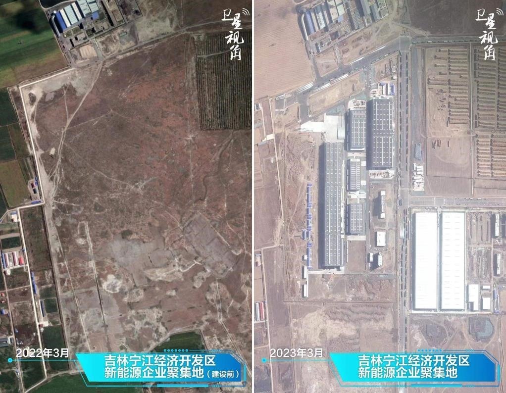 ↑2023年與2022年相比,吉林寧江經(jīng)濟開發(fā)區(qū)的一片空地建設(shè)成頗具規(guī)模的新能源企業(yè)聚集地。
