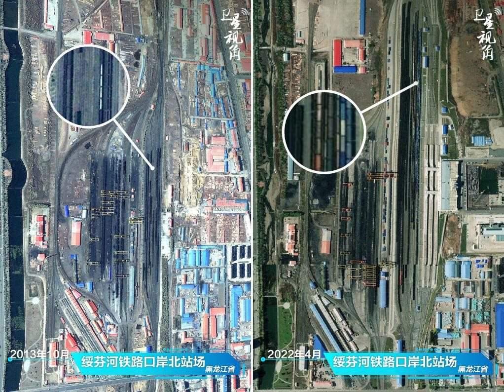 ↑2022年與2013年相比,綏芬河鐵路口岸貨運列車增多,反映外貿(mào)活力增強。