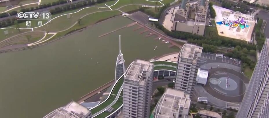 總臺記者 梁燁:但是要說溫州什么運動最熱鬧,那就肯定是龍舟了。我們現(xiàn)在看到的是溫州龍舟運動中心,這里是全亞洲最高標(biāo)準(zhǔn)的龍舟賽場。我們從空中俯瞰,整棟樓看起來非常狹長,并且高低起伏猶如山脈,就好像是一條龍靜臥在水面之上,因此,這幢樓也被稱為“龍樓”。比賽時,這里主要作賽事保障用途。緊挨著龍樓的這座,從正面看像是船槳,從側(cè)面看像龍舟的建筑就是舟塔,這也是比賽的終點塔。比賽期間,裁判員們就會在這里觀看比賽,在這里計時計分。此時此刻,我們看到水面上正在進行演練,他們所劃行的這1200米的賽道到時候就是龍舟的比賽場地。