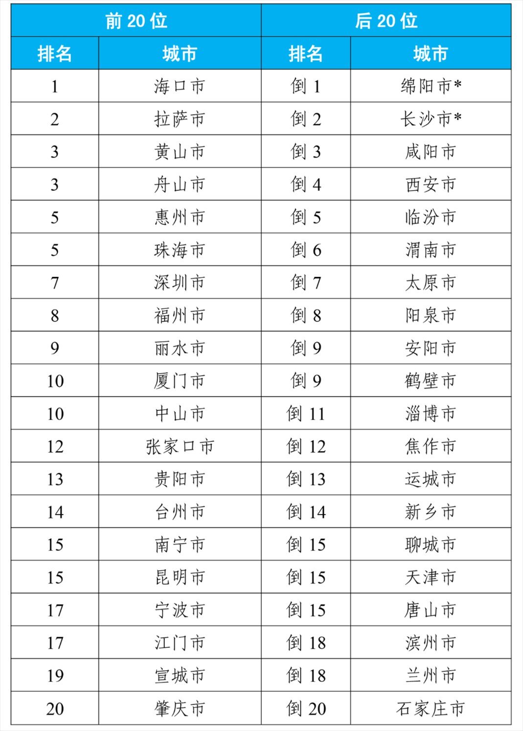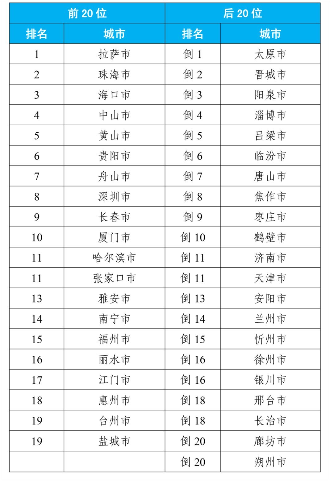 8月,168個重點城市中,空氣質(zhì)量排名前20位城市依次是拉薩、珠海和??诘瘸鞘校◤牡?名至并列第19名);空氣質(zhì)量排名后20位城市依次是太原、晉城和陽泉等城市(從倒數(shù)第1名至并列倒數(shù)第20名)。見附表1。
