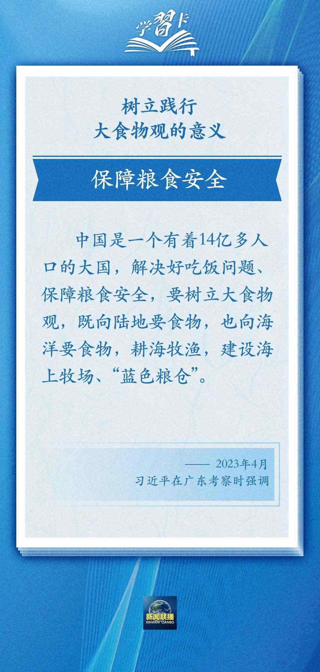 今年4月,總書記在廣東湛江考察時指出,要樹立大食物觀,既向陸地要食物,也向海洋要食物。前不久,總書記主持召開新時代推動東北全面振興座談會強調(diào),踐行大食物觀,把農(nóng)業(yè)建成大產(chǎn)業(yè)。