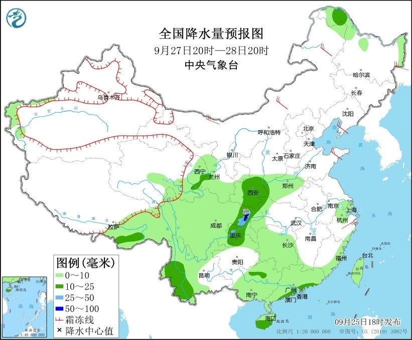 9月25日20時(shí)至26日20時(shí),廣東西南部、廣西南部、海南島以及新疆北疆北部、西藏東南部、陜西南部等地部分地區(qū)有中到大雨,其中,海南島東部和南部等地部分地區(qū)有暴雨或大暴雨(100~180毫米)。另外,新疆阿勒泰山區(qū)有雨夾雪或雪。內(nèi)蒙古中西部、山東半島等地部分地區(qū)有4~6級(jí)風(fēng)(見(jiàn)圖1)。