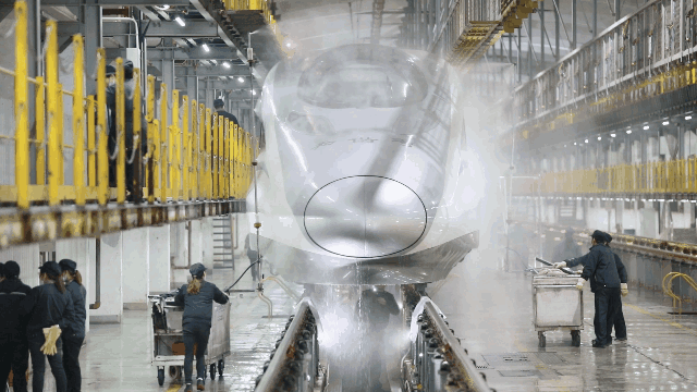 在外“奔波”了一整天的高鐵動車組回到動車所后,首先會沿著鋼軌來到洗車房“洗個澡”。當(dāng)動車通過洗車房時,“機洗房”便自動開啟智能工作模式。列車以3至5公里的時速開過“澡堂”時,數(shù)十個“花灑”噴嘴會給車身預(yù)濕,之后的噴嘴噴灑專用“沐浴露”,斜刷、側(cè)刷、底刷快速投入工作。