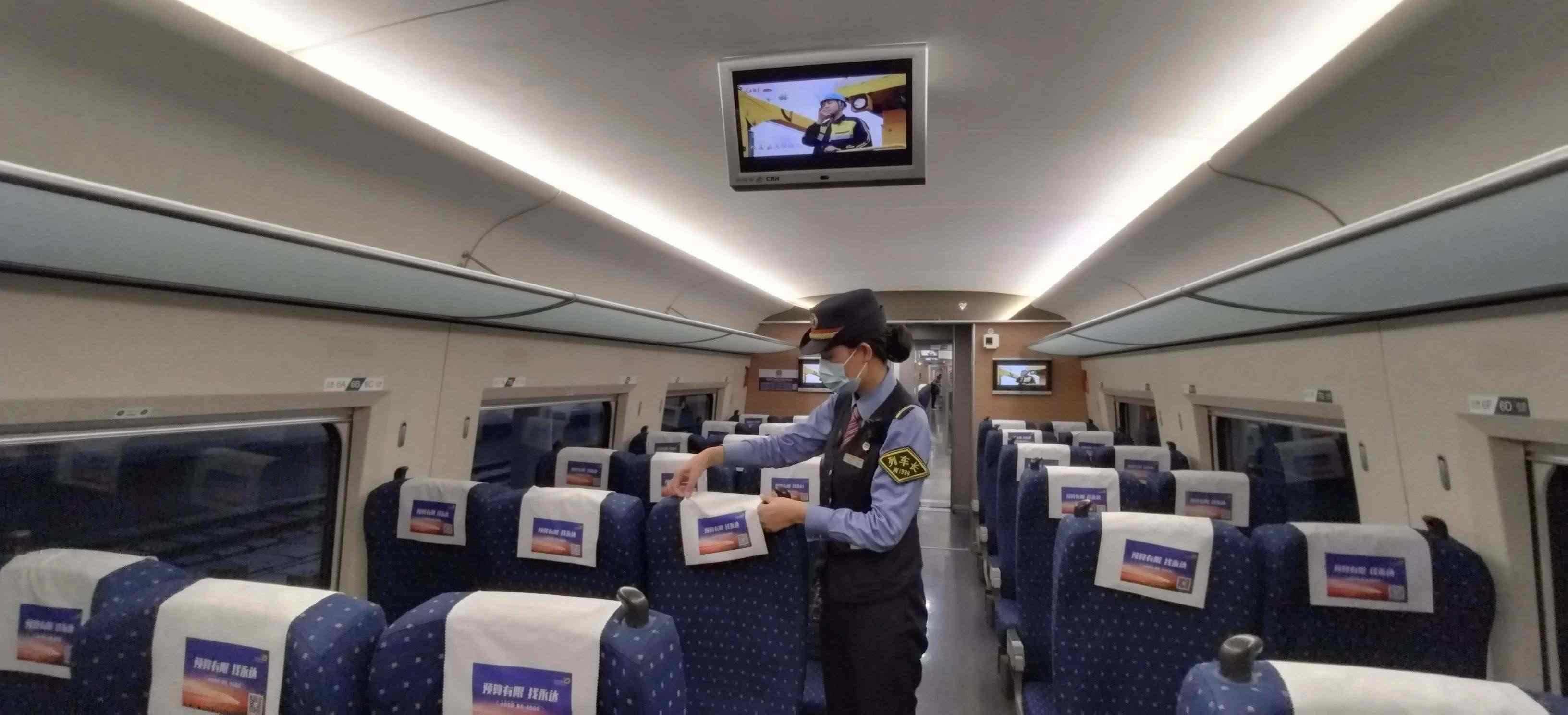 除了車身硬件的“美妝”,在列車上線始發(fā)前,列車乘務(wù)人員還要檢查各類客運服務(wù)備品、衛(wèi)生備品等是否準(zhǔn)備齊全。他們需要保證車座椅背后網(wǎng)兜清潔袋擺放整齊,小桌板統(tǒng)一收起,頭枕巾和椅套擺放平整、干凈、無污染。