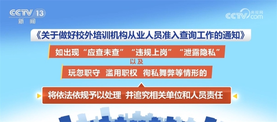 此外,《通知》強調嚴明查詢管理責任。各級教育部門和相關主管部門、校外培訓機構及其工作人員應履行準入查詢的法定職責,如出現“應查未查”“違規(guī)上崗”“泄露隱私”以及玩忽職守、濫用職權、徇私舞弊等情形的,將依法依規(guī)予以處理,并追究相關單位和人員責任。