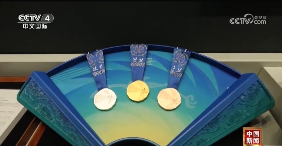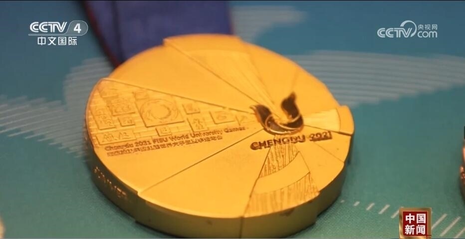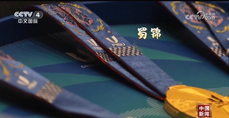 總臺(tái)記者 王豐:走進(jìn)成都大運(yùn)會(huì)博物館,最大的感受就是成都的元素?zé)o處不在。比如,我們剛一進(jìn)來(lái),右手邊是成都大運(yùn)會(huì)的吉祥物蓉寶??赐耆貙殠鷣?lái)看看蓉光,什么是蓉光呢?獎(jiǎng)牌代表了成都大運(yùn)會(huì)的榮譽(yù),“蓉”是取自成都的簡(jiǎn)稱,包含了光榮和融合的含義,整個(gè)獎(jiǎng)牌的設(shè)計(jì)是呈現(xiàn)了不規(guī)則的圓形。另外,獎(jiǎng)牌的元素包含成都市的標(biāo)志——太陽(yáng)神鳥(niǎo)。此外,在獎(jiǎng)牌的綬帶設(shè)計(jì)上首次采用了蜀錦的制作工藝,實(shí)際上也是非物質(zhì)文化遺產(chǎn)活化利用的非常好的案例。
