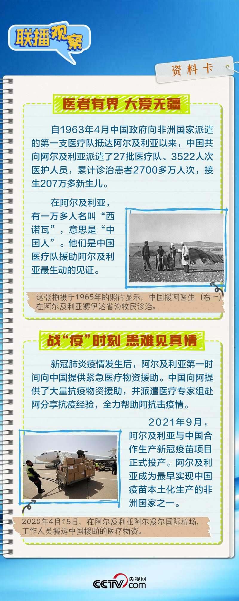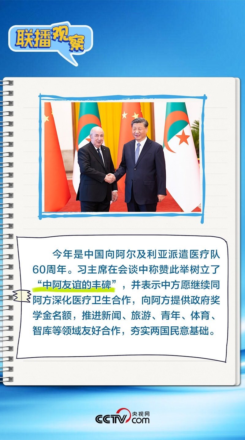 會(huì)談中,習(xí)主席特別提到,今年是中國向阿爾及利亞派遣醫(yī)療隊(duì)60周年,并稱贊此舉樹立了“中阿友誼的豐碑”。中阿傳統(tǒng)友誼深厚,兩國始終相互尊重、平等相待、彼此支持,締造了一段段友好交往的佳話。