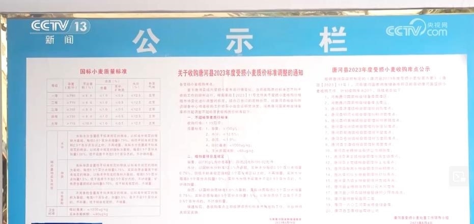 記者在這家糧食儲(chǔ)備庫的公示欄里看到了一份《收購(gòu)唐河縣受損小麥質(zhì)價(jià)標(biāo)準(zhǔn)調(diào)整的通知》,里面明確了受損小麥的收購(gòu)價(jià)格是1.15元每斤,而這個(gè)價(jià)格只比正常小麥?zhǔn)召?gòu)價(jià)1.4元左右低了0.3元。這張通知的落款日期是6月4日,而當(dāng)?shù)剞r(nóng)戶普遍是在6月3日收完糧食,這也在第一時(shí)間讓老百姓吃下了“定心丸”。