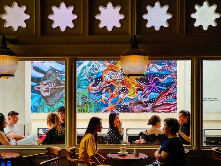 6月21日,人們?cè)诔啥即笤粗醒牍珗@內(nèi)的咖啡館喝咖啡。新華社記者 沈伯韓 攝