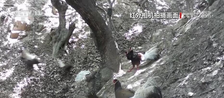 近日,在山西呂梁的孝義市國有林場(chǎng),紅外相機(jī)記錄到國家一級(jí)保護(hù)野生動(dòng)物褐馬雞最大種群。畫面中,先是兩群褐馬雞在兩棵老樹下覓食玩耍,兩個(gè)樹洞內(nèi)積有雨水,它們不斷地前往飲水補(bǔ)給。突然,一只落單的成年褐馬雞入侵,遭到領(lǐng)地一只雄性褐馬雞的追逐驅(qū)趕。不同角度的紅外相機(jī)還捕捉到褐馬雞好奇對(duì)視相機(jī)、幼崽上樹打鬧等趣味十足的珍貴影像。
