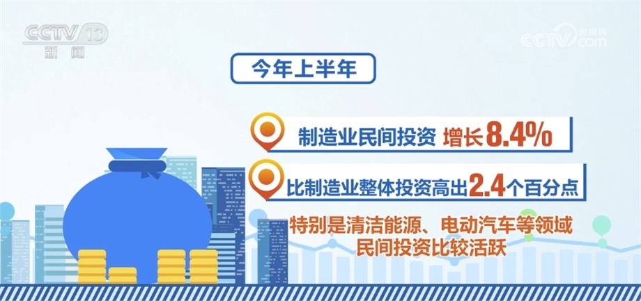 國(guó)家發(fā)展改革委相關(guān)負(fù)責(zé)人表示,當(dāng)前,民間投資結(jié)構(gòu)持續(xù)優(yōu)化,一些領(lǐng)域民間投資顯現(xiàn)了不少亮點(diǎn)。今年上半年,除房地產(chǎn)開發(fā)以外的民間投資同比增長(zhǎng)9.4%,增速比全部投資高5.6個(gè)百分點(diǎn);制造業(yè)民間投資增長(zhǎng)8.4%,比制造業(yè)整體投資高出2.4個(gè)百分點(diǎn),特別是清潔能源、電動(dòng)汽車等領(lǐng)域民間投資比較活躍;基礎(chǔ)設(shè)施民間投資增長(zhǎng)15.6%,比基礎(chǔ)設(shè)施整體投資高出8.4個(gè)百分點(diǎn),呈現(xiàn)出較強(qiáng)的投資信心和投資動(dòng)力。