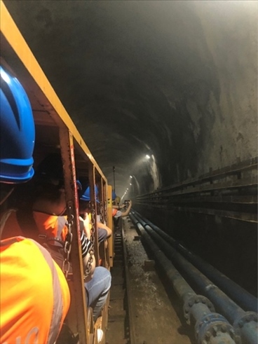 圖為采風團乘坐纜車前往江門中微子地下實驗室。(新華網(wǎng) 王慰攝)