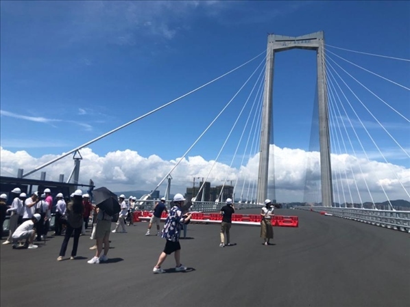 在中山市深中通道中山大橋段采風點,采風團成員踏上已完成鋪裝的橋面,近距離一睹大橋“英姿”。在建的深中通道連接廣東省境內的深圳、中山兩市,全長約24公里。建成通車后,從中山到深圳開車可在半小時內到達,大大縮短了中山至深圳、香港等地的通行距離。這一建設工程,對于深化打造珠江口岸“黃金內灣”的生活圈,推動粵港澳大灣區(qū)城市群融合發(fā)展具有重要意義。目前,深中通道建設已進入收尾階段,預計2024年通車。