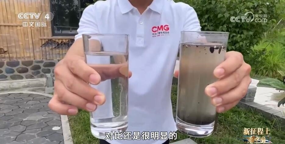 農(nóng)污管理技術(shù)員 韋星任:這邊有三個(gè)杯子。首先,這杯水是處理之前的,你可以對(duì)感受一下,這個(gè)是生活污水。第二個(gè)杯子里就是我們終端出水。