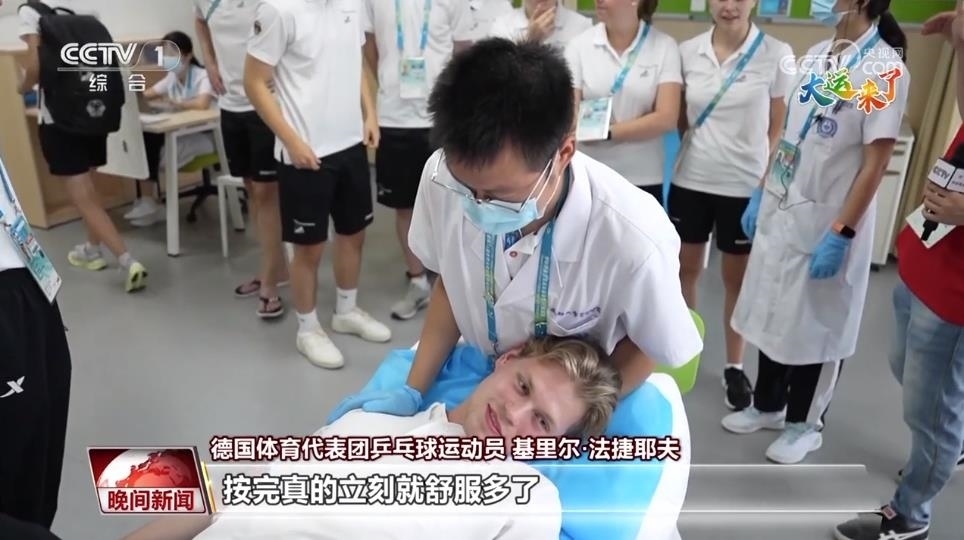 德國(guó)體育代表團(tuán)乒乓球運(yùn)動(dòng)員 尼爾斯·霍邁爾:不敢想象在大運(yùn)村還有這么好的醫(yī)療服務(wù),之前完全沒想到。在德國(guó)也有一些診所提供類似服務(wù),但能在這里感受一手的中醫(yī)康復(fù)服務(wù),真的太酷了。