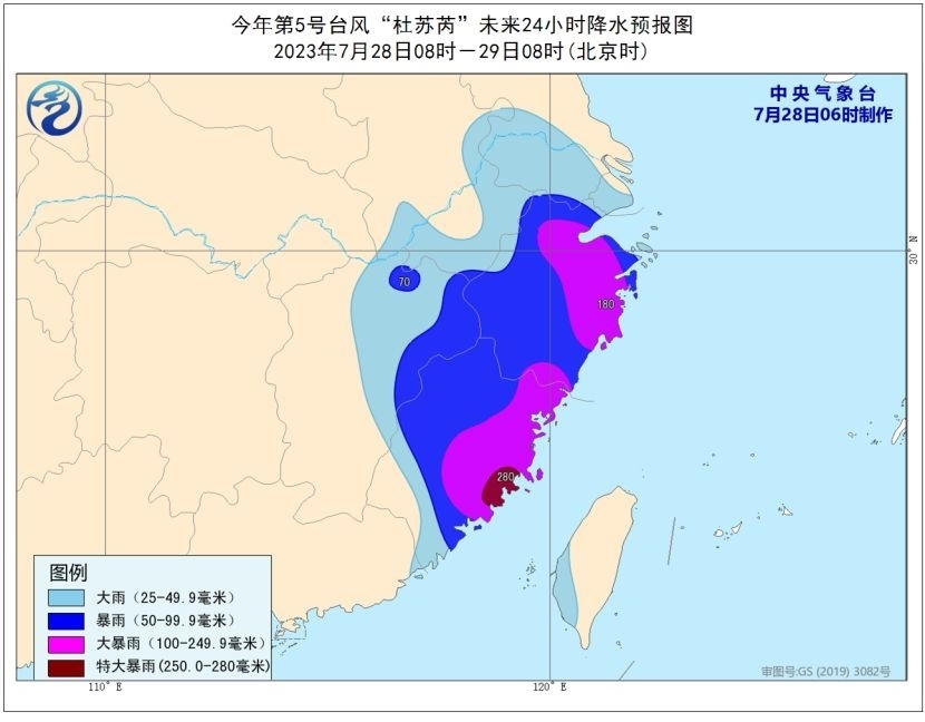 大風預報:28日08時至29日08時,巴士海峽、南海東部和南部、臺灣以東洋面、臺灣海峽、東海大部,以及臺灣島及其沿海、福建及其沿海、浙江及其沿海、江西東部、江蘇沿海、上海及其沿海、廣東東部沿海將有5-7級風、陣風8-9級,其中南海東北部偏東海域、臺灣海峽、福建南部的部分地區(qū)及沿海、臺灣島西部沿海風力可達8-12級、陣風13-15級,“杜蘇芮”中心經(jīng)過的附近海域風力可達13-16級,陣風17級及以上。