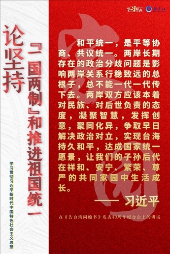 解決臺灣問題、實現祖國完全統(tǒng)一,是中國共產黨矢志不渝的歷史任務,是全體中華兒女的共同愿望,是實現中華民族偉大復興的必然要求。必須堅持貫徹新時代黨解決臺灣問題的總體方略,牢牢把握兩岸關系主導權和主動權,堅定不移推進祖國統(tǒng)一大業(yè)。