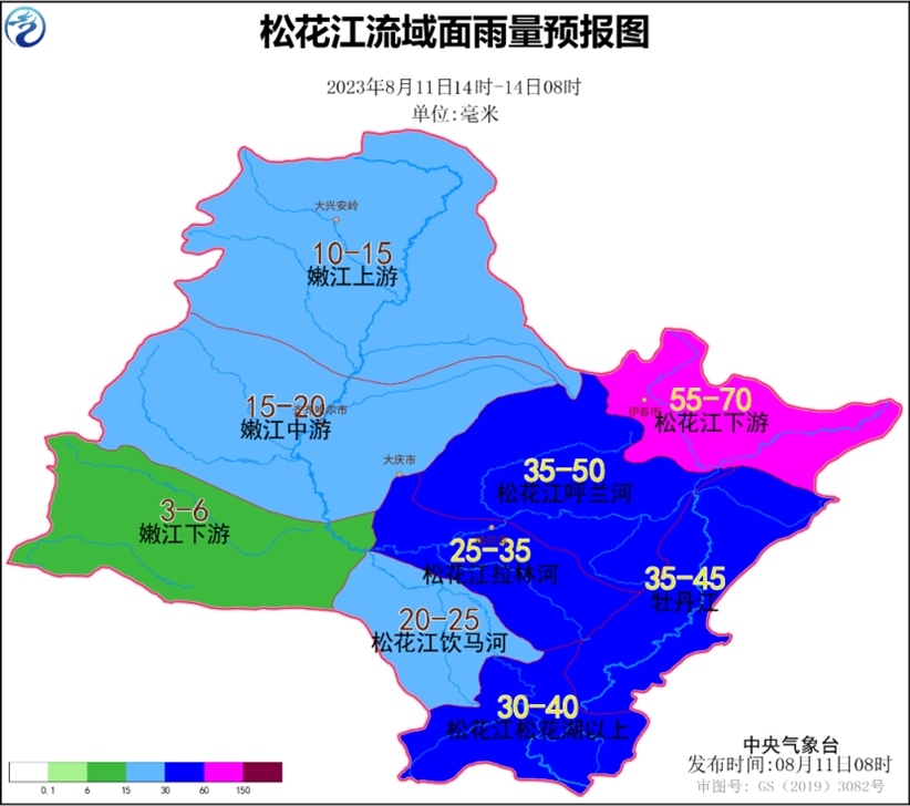松花江流域面雨量預報:11日下午至13日,松花江流域中東部面雨量20~55毫米,其中松花江下游面雨量55~70毫米;鴨綠江、圖們江、綏芬河子流域面雨量40~45毫米。
