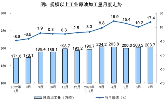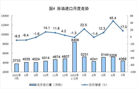 原油產(chǎn)量小幅增加,進(jìn)口保持較快增長。7月份,生產(chǎn)原油1731萬噸,同比增長1.0%,增速比6月份放緩0.9個百分點(diǎn),日均產(chǎn)量55.8萬噸。進(jìn)口原油4369萬噸,同比增長17.0%,增速比6月份回落28.4個百分點(diǎn)。