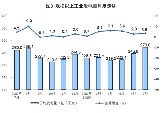 電力生產(chǎn)有所加快。7月份,發(fā)電量8462億千瓦時,同比增長3.6%,增速比6月份加快0.8個百分點(diǎn),日均發(fā)電273.0億千瓦時。1—7月份,發(fā)電量50130億千瓦時,同比增長3.8%。