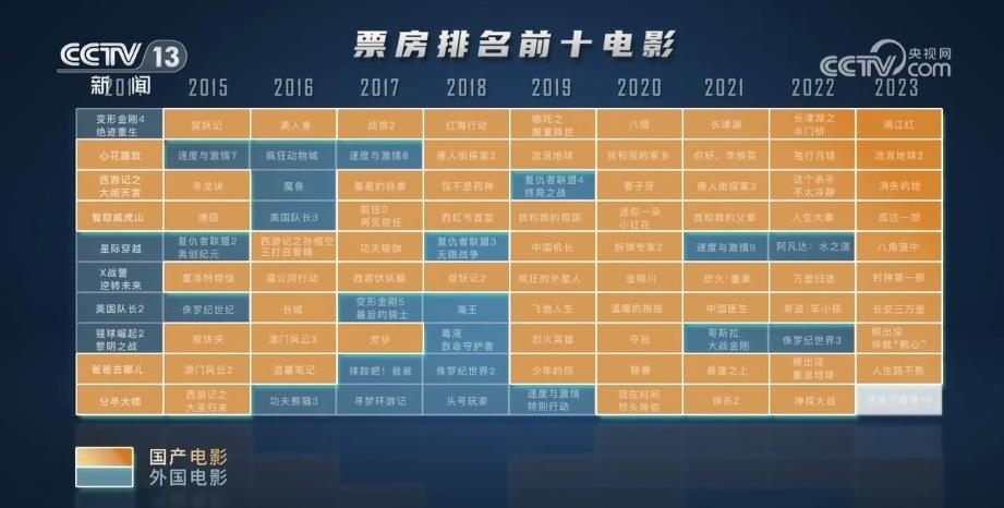 央視網(wǎng)消息:國家電影局最新發(fā)布統(tǒng)計數(shù)據(jù)顯示,2023年暑期檔電影票房已達178億元,超過2019年暑期檔總票房,創(chuàng)歷史新高。是什么點燃了觀眾對電影的熱情? 通過對近10年票房前10名的電影片尾字幕提取,用數(shù)據(jù)洞察國產(chǎn)電影的發(fā)展。