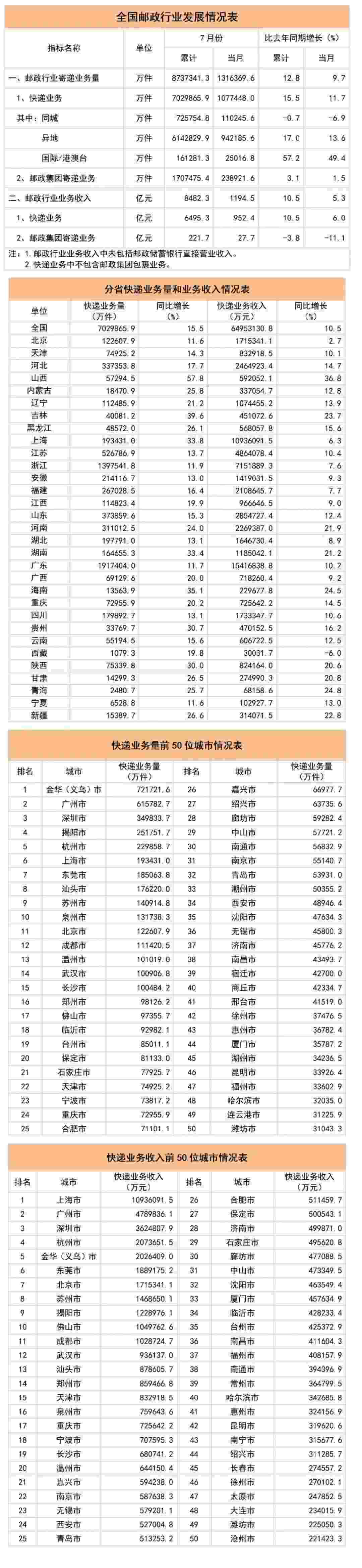 1-7月,郵政行業(yè)業(yè)務(wù)收入(不包括郵政儲蓄銀行直接營業(yè)收入)累計完成8482.3億元,同比增長10.5%。其中,快遞業(yè)務(wù)收入累計完成6495.3億元,同比增長10.5%。7月份,郵政行業(yè)寄遞業(yè)務(wù)量完成131.6億件,同比增長9.7%。其中,快遞業(yè)務(wù)量完成107.7億件,同比增長11.7%。7月份,郵政行業(yè)業(yè)務(wù)收入完成1194.5億元,同比增長5.3%。其中,快遞業(yè)務(wù)收入完成952.4億元,同比增長6.0%。1-7月,同城、異地、國際/港澳臺快遞業(yè)務(wù)量分別占全部快遞業(yè)務(wù)量的10.3%、87.4%和2.3%;業(yè)務(wù)收入分別占全部快遞收入的6.0%、50.6%和11.2%。與去年同期相比,同城快遞業(yè)務(wù)量的比重下降1.7個百分點,異地快遞業(yè)務(wù)量的比重上升1.1個百分點,國際/港澳臺業(yè)務(wù)量的比重上升0.6個百分點。