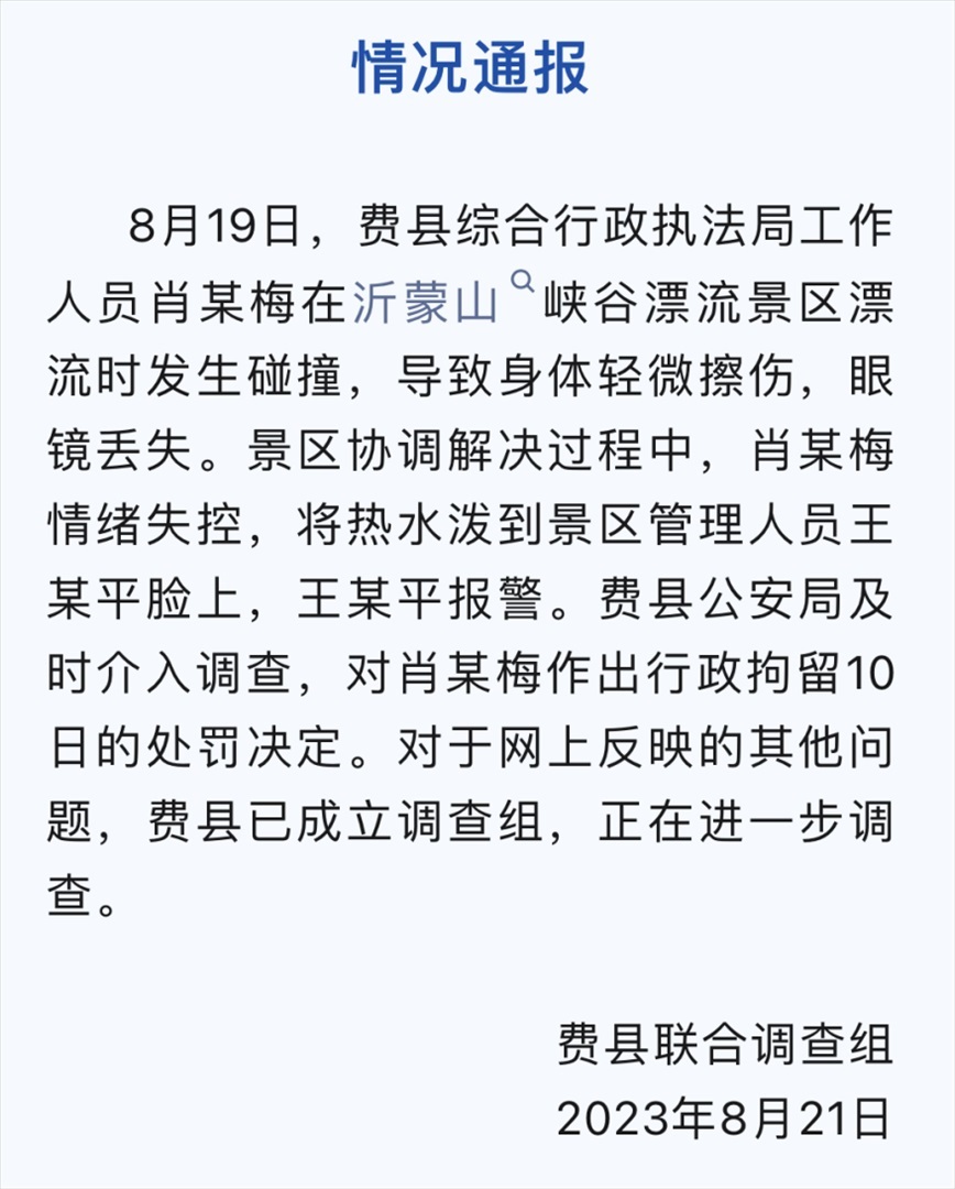 ·山東費縣行政執(zhí)法局一副局長家屬向景區(qū)員工連潑3杯熱水,被行政拘留10日。