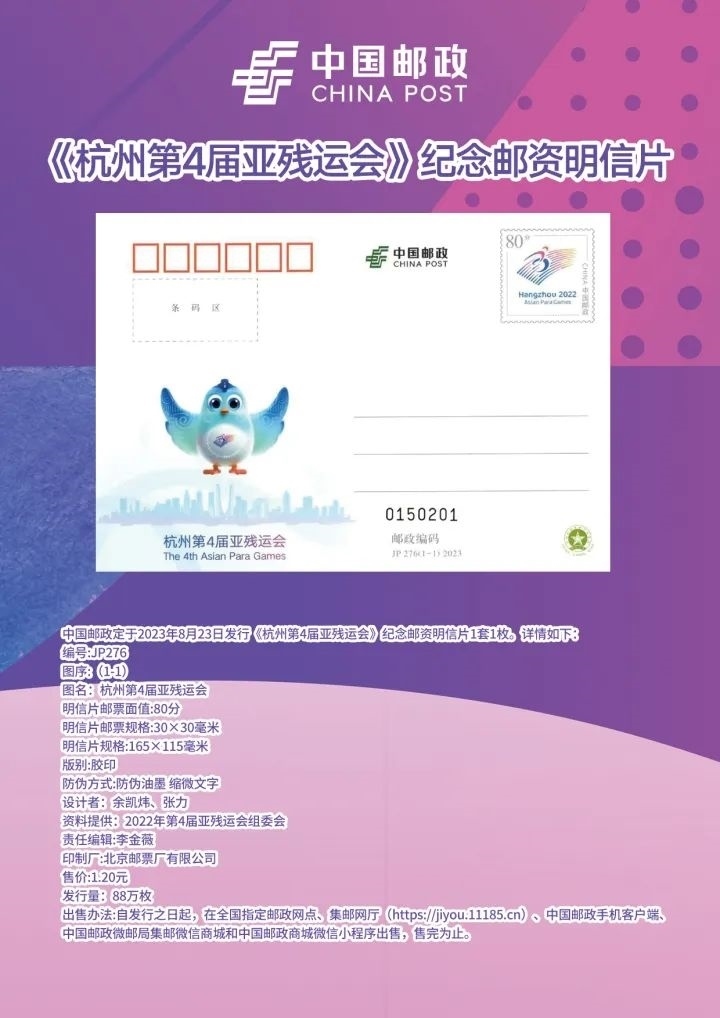 今天,中國郵政還發(fā)行了《杭州第4屆亞殘運會》紀(jì)念郵資明信片一套1枚,編號為JP276。郵資圖為杭州亞殘運會會徽,主體表現(xiàn)杭州亞殘運會名稱和吉祥物飛飛,襯以杭州城市剪影,體現(xiàn)“兩個亞運,同樣精彩”的辦賽理念,激勵殘疾人運動員在競技舞臺上,展現(xiàn)勇于挑戰(zhàn)、戰(zhàn)勝自我、創(chuàng)造幸福的良好精神風(fēng)貌。