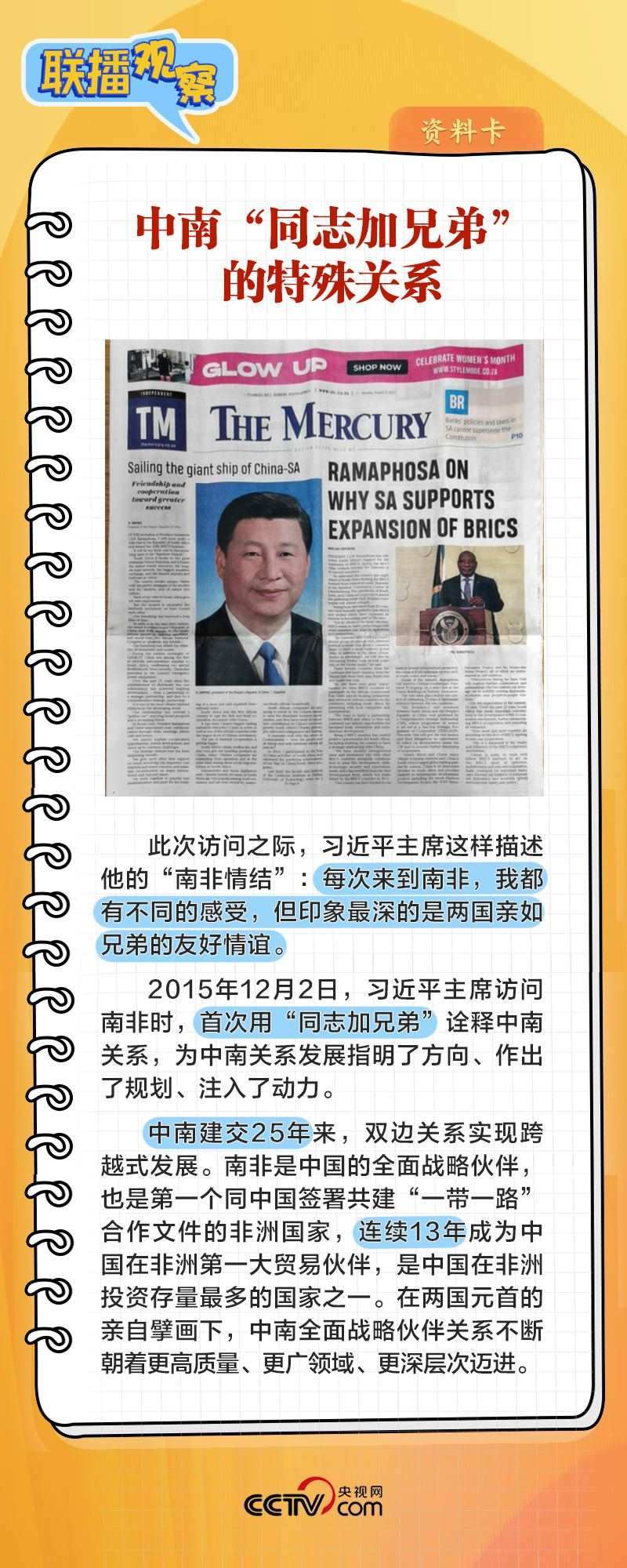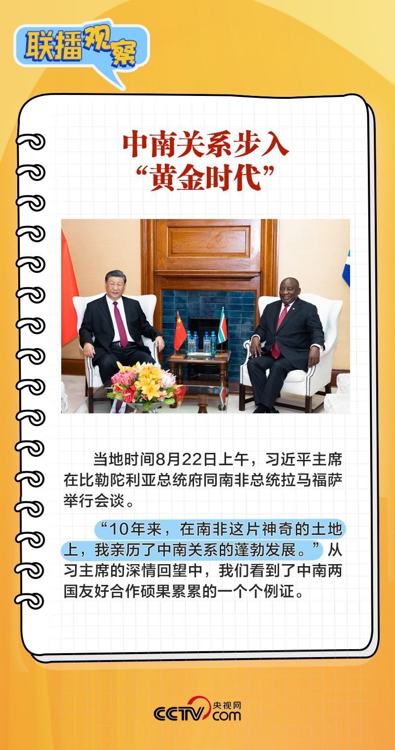 8月22日上午,在同南非總統(tǒng)拉馬福薩舉行會(huì)談時(shí),習(xí)主席表示:“中南關(guān)系之所以好、中南友誼之所以深,關(guān)鍵在于兩國(guó)兩黨在各自發(fā)展道路上休戚與共,結(jié)下了同志加兄弟的深厚友誼?!?/p>