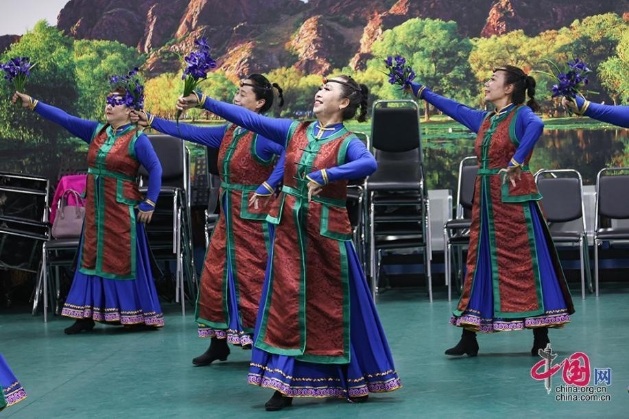 在臨潢家園社區(qū)便民服務中心內,由社區(qū)里各民族居民組成的烏蘭牧騎小分隊正在排練廳內練習舞蹈。中國網記者 倫曉璇 攝