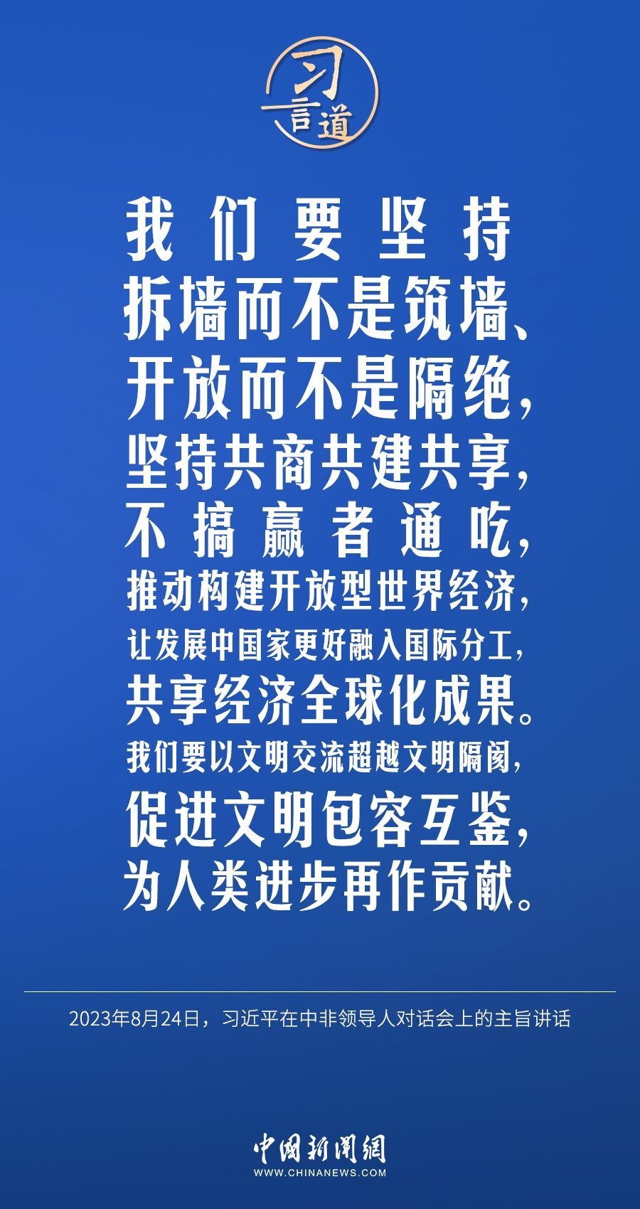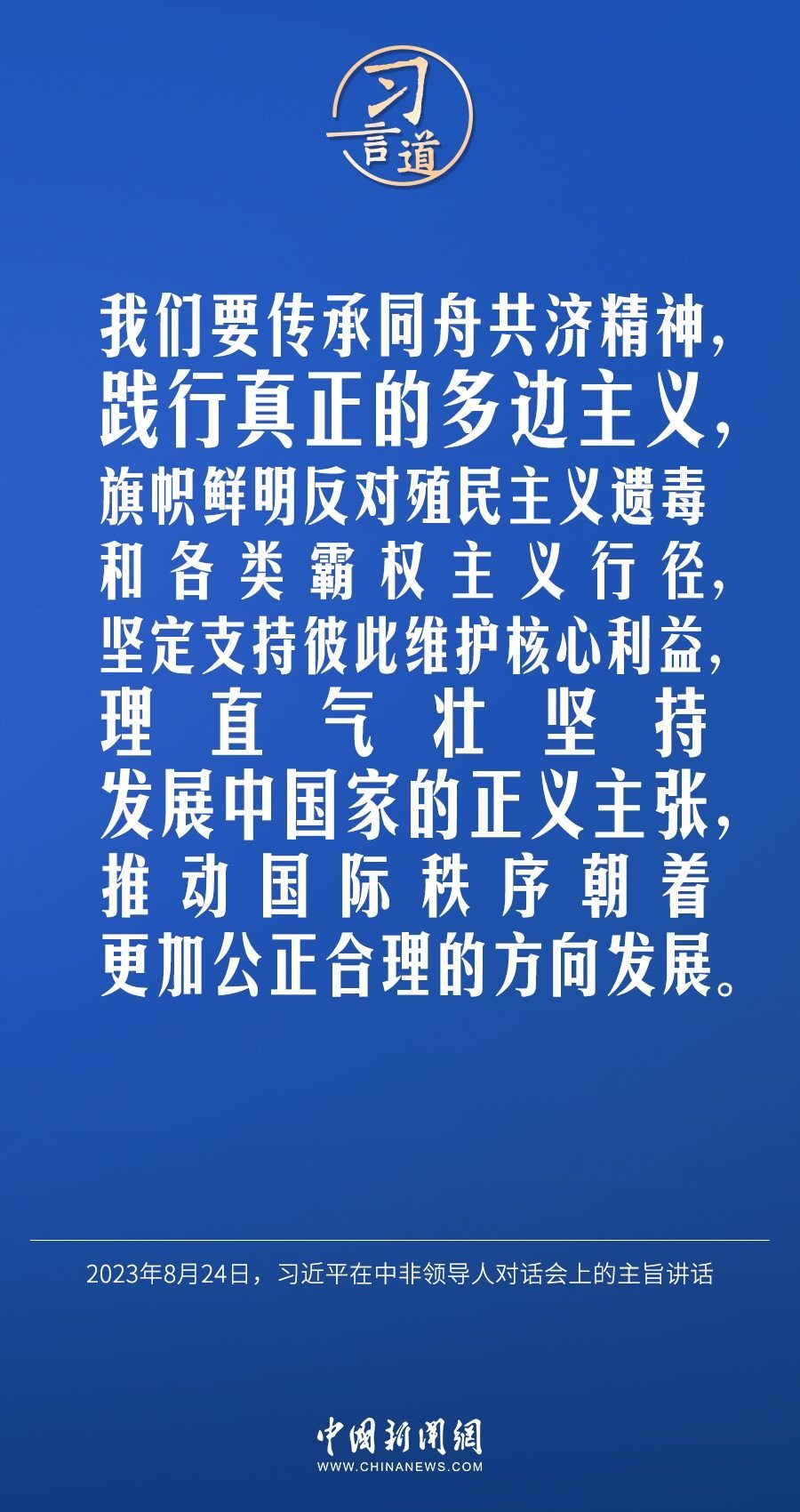當(dāng)?shù)貢r間8月24日晚,國家主席習(xí)近平和南非總統(tǒng)拉馬福薩在約翰內(nèi)斯堡共同主持中非領(lǐng)導(dǎo)人對話會。習(xí)近平發(fā)表題為《攜手推進現(xiàn)代化事業(yè) 共創(chuàng)中非美好未來》的主旨講話。習(xí)近平指出——